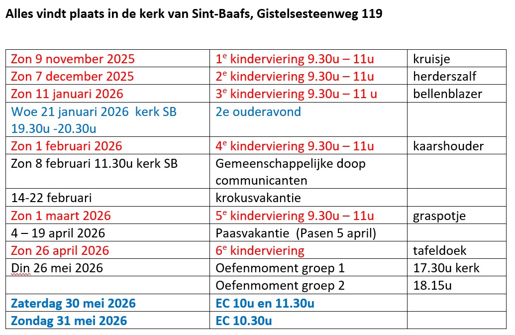 Alle info bij het secretariaat eerste communiewerking, tel 0498 67 73 61